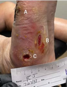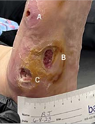 A 70 YEAR OLD FEMALE with osteoarthritis, hypertension, and neuropathy presented with three pressure/neuropathic ulcers on right foot that had been present for four months with a history of infection. Treated at wound clinic without significant improvement. Referred to vascular specialist who determined adequate blood flow for healing and no significant PAD.