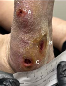 6-WEEK VISIT After surgery to remove infected bone and resolution of infection; post-debridement applied 2 x 2 cm Impax to all wounds