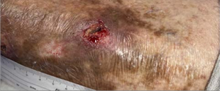 A 77 YEAR OLD FEMALE with H/O left leg venous insufficiency and previous venous ulcerations. Left leg wound started with trauma from car door one month prior. Applied collagenase ointment daily for four weeks without significant improvement.